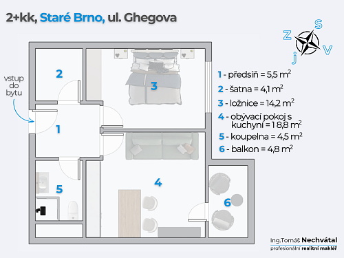Nabízím k pronájmu zcela nový byt o dispozici 2+kk v novostavbě bytového domu na ulici Ghegova ve Starém Brně. Jedná se o byt, ve kterém dosud nikdo nebydlel – budete jeho první nájemníci.