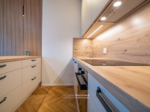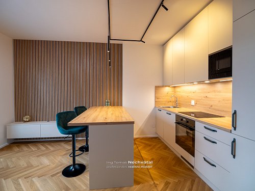 Obývací pokoj je propojen s moderní kuchyňskou linkou (Kuchyně HANÁK) na míru včetně vestavných spotřebičů Elektrolux (indukční varná deska, trouba, mikrovlnná trouba, digestoř a plnohodnotná myčka). Dominantou prostoru je pracovní/servírovací ostrůvek, který zároveň plní funkci jídelního stolu. Z obývací části je přímý vstup na balkon.