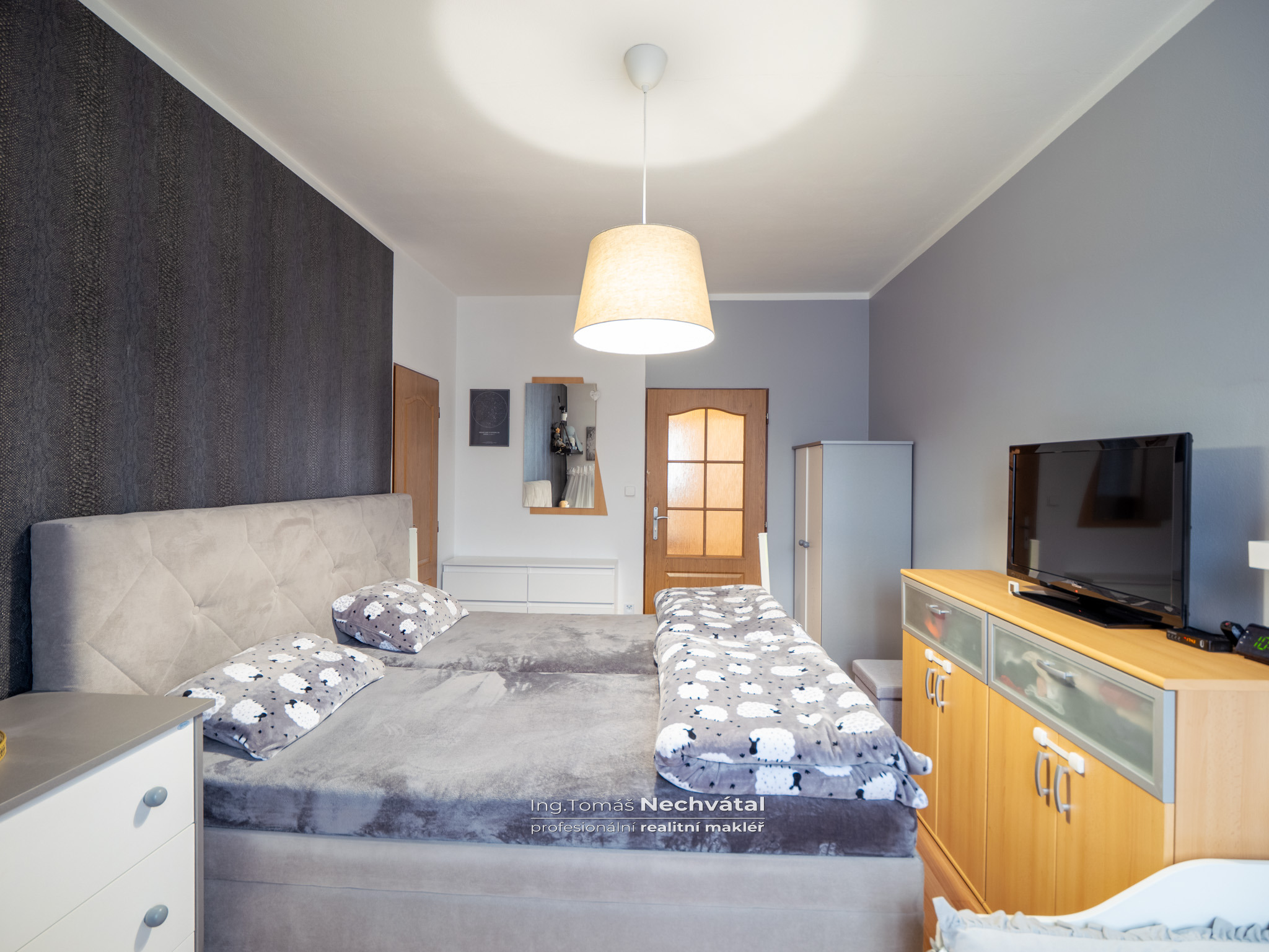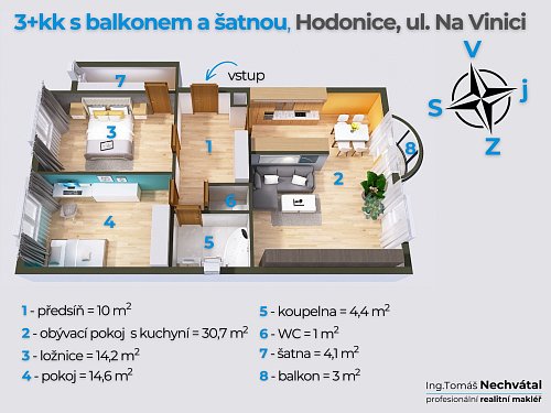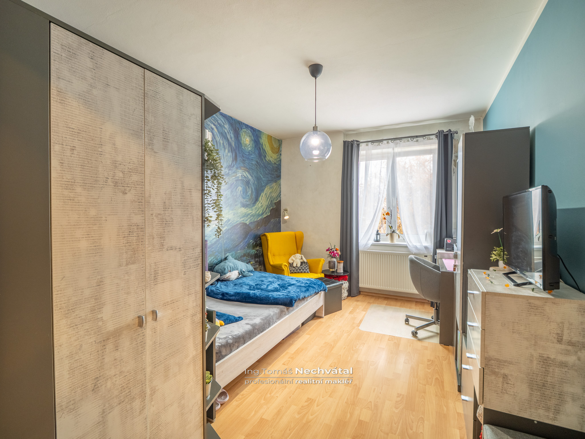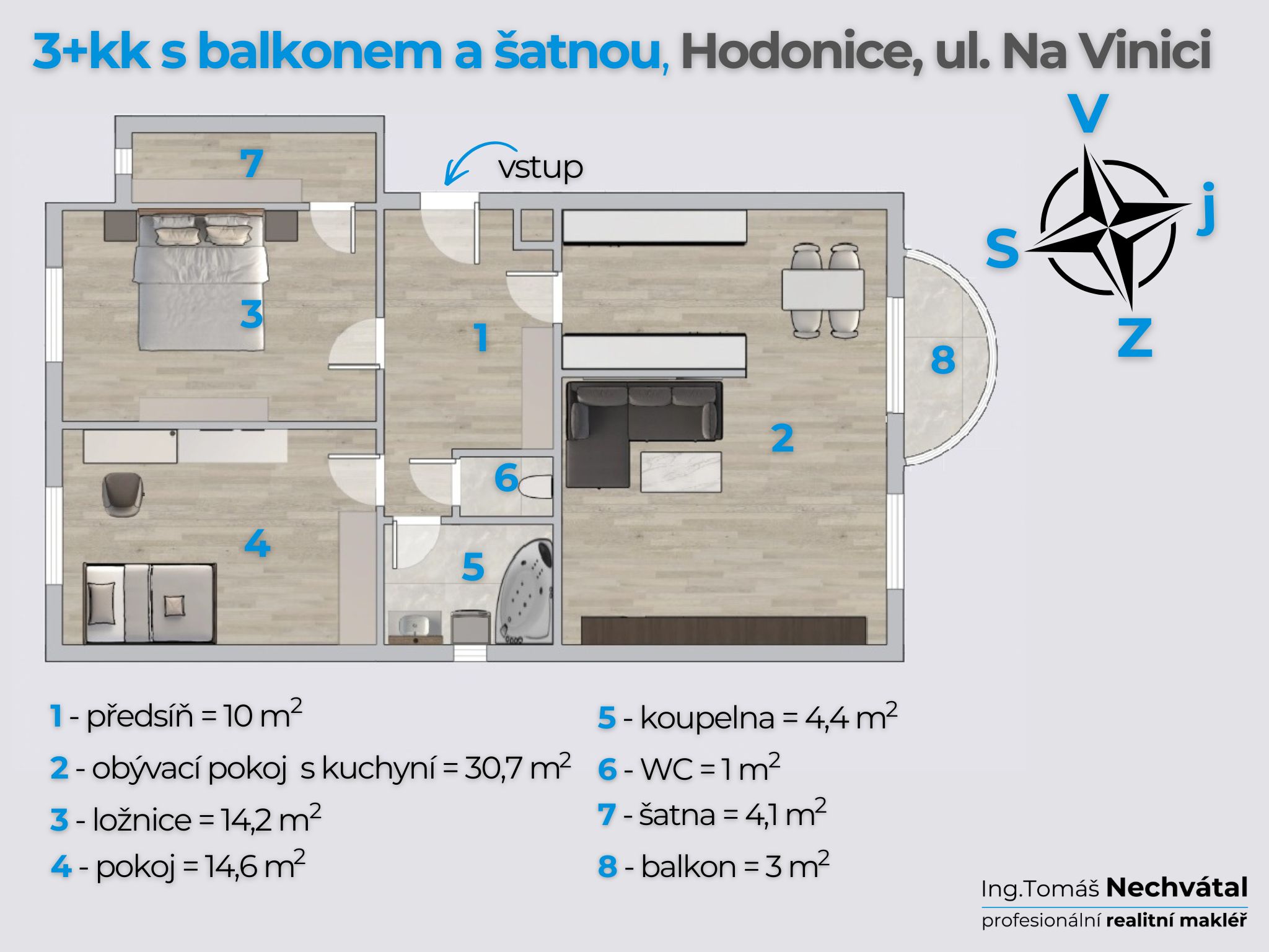 Dispozice je promyšlená a praktická. Obývací pokoj s kuchyní je orientovaný na slunný jih, pokoje naopak na klidnější a chladnější sever. Byt má dvě samostatné ložnice, takže funguje jak pro rodinu, tak pro pár nebo kombinaci bydlení a práce z domova. Příjemným bonusem je plnohodnotná šatna, která se vždycky hodí.