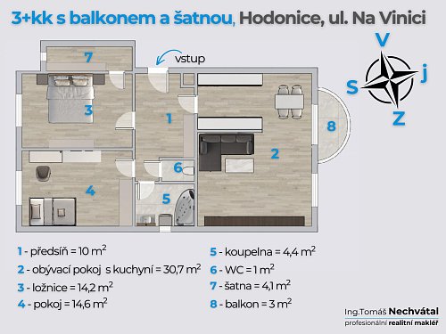 Vítám vás v komorním bytovém domě v klidné části Hodonic. Žádná rušná silnice, žádný chaos, jen šest bytů na vchod a příjemná atmosféra menšího domu. A v prvním patře 3+kk (třikákáčko) o podlahové ploše 83 metrů čtverečních.